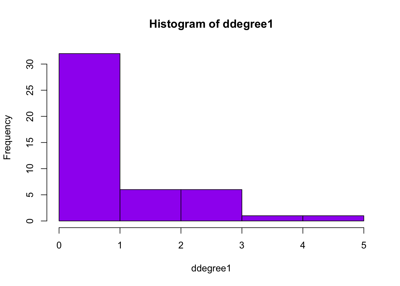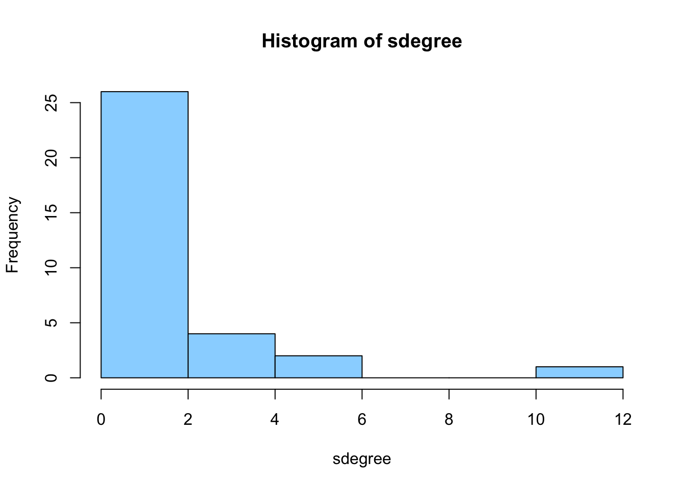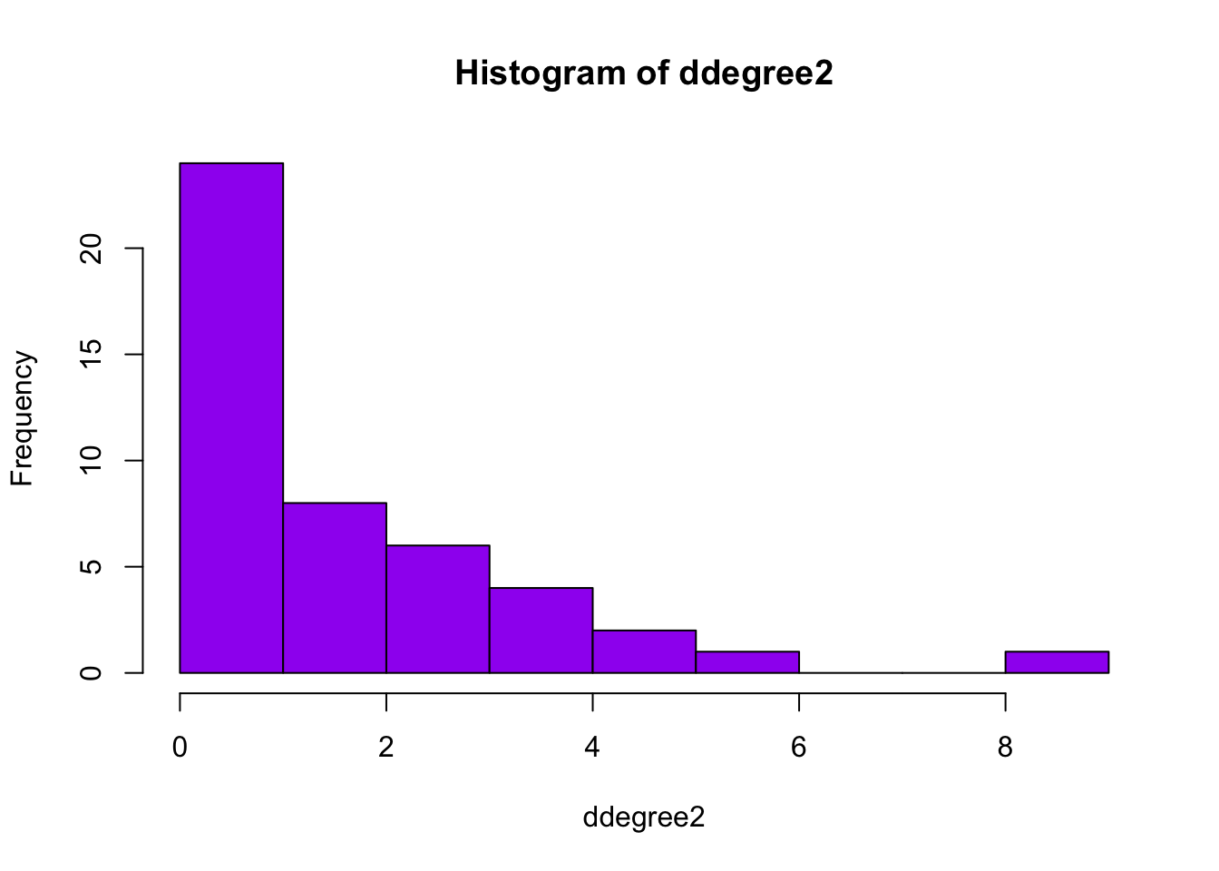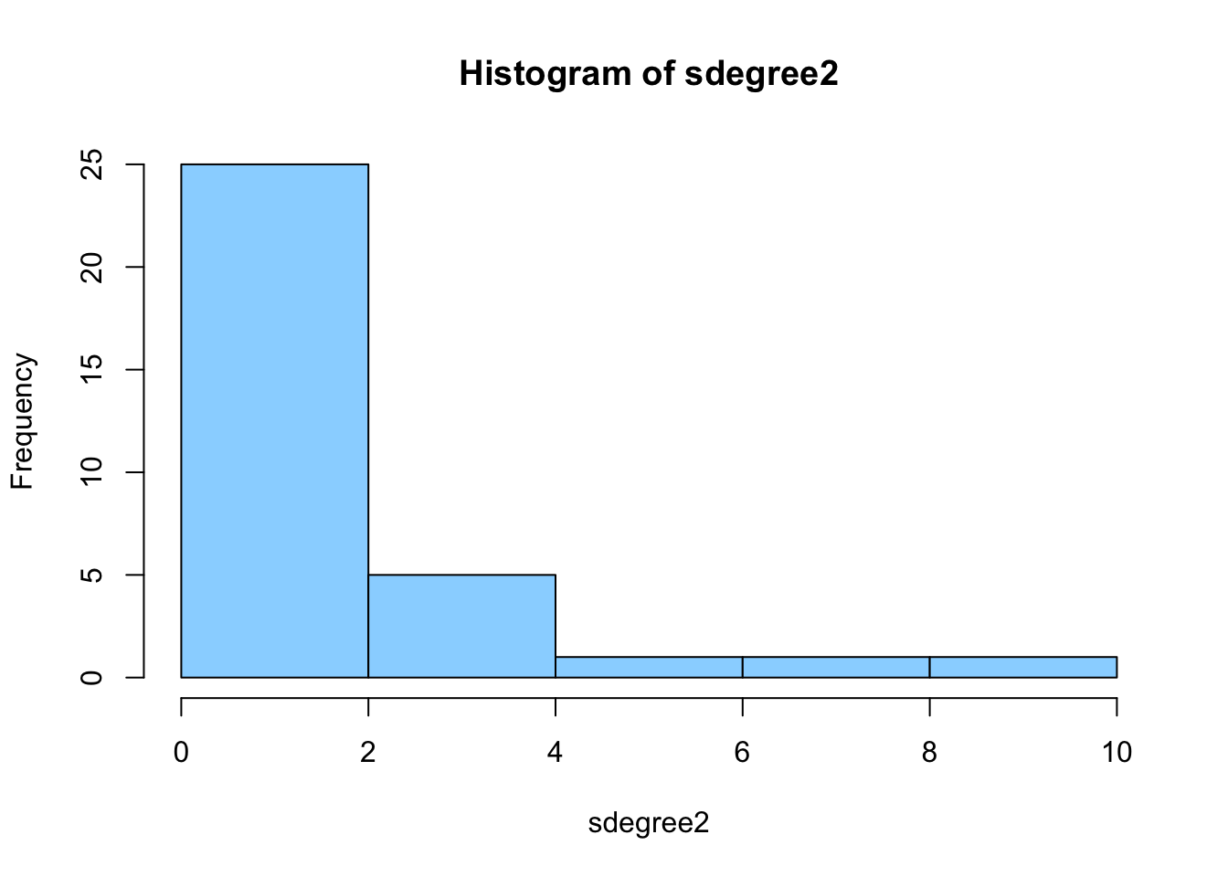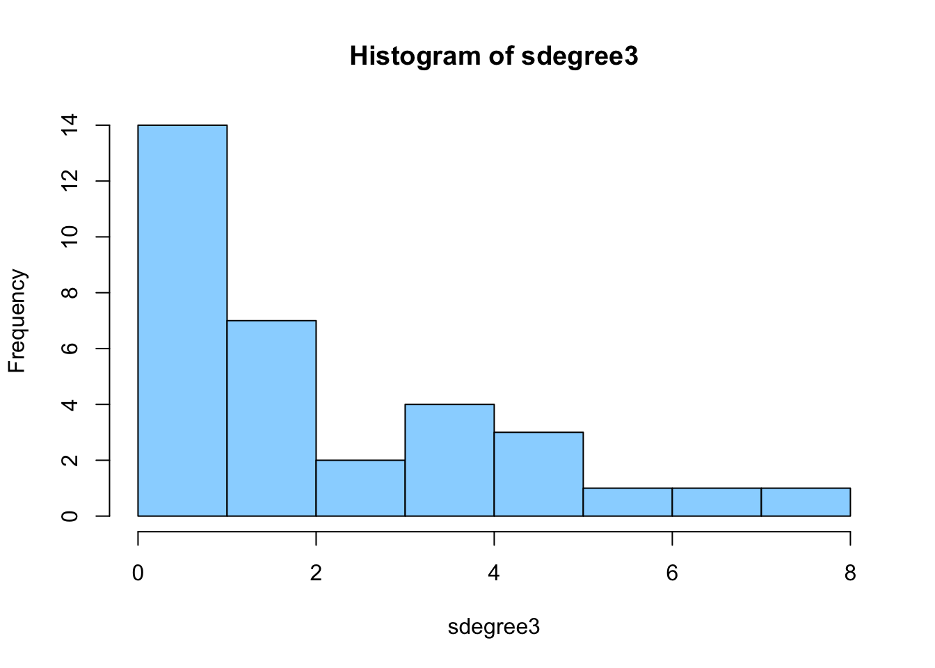 LS0tCnRpdGxlOiAiRGVzY3JpcHRpdmUgU3RhdGlzdGljcyIKYXV0aG9yOiAiQW51c2Noa2EgUGVlbGVuIgpkYXRlOiAiYHIgU3lzLkRhdGUoKWAiCm91dHB1dDogCiAgaHRtbF9kb2N1bWVudDoKICAgICBjb2RlX2ZvbGRpbmc6ICJoaWRlIgplZGl0b3Jfb3B0aW9uczogCiAgbWFya2Rvd246IAogICAgd3JhcDogNzIKLS0tCgpgYGB7ciBzZXR1cCwgaW5jbHVkZT1GQUxTRX0Ka25pdHI6Om9wdHNfY2h1bmskc2V0KGVjaG8gPSBUUlVFKQpgYGAKCmBgYHtyLCBnbG9iYWxzZXR0aW5ncywgZWNobz1GQUxTRSwgd2FybmluZz1GQUxTRSwgcmVzdWx0cz0naGlkZSd9CmxpYnJhcnkoa25pdHIpCgprbml0cjo6b3B0c19jaHVuayRzZXQoZWNobyA9IFRSVUUpCm9wdHNfY2h1bmskc2V0KHRpZHkub3B0cz1saXN0KHdpZHRoLmN1dG9mZj0xMDApLHRpZHk9VFJVRSwgd2FybmluZyA9IEZBTFNFLCBtZXNzYWdlID0gRkFMU0UsY29tbWVudCA9ICIjPiIsIGNhY2hlPVRSVUUsIGNsYXNzLnNvdXJjZT1jKCJ0ZXN0IiksIGNsYXNzLm91dHB1dD1jKCJ0ZXN0MiIpKQpvcHRpb25zKHdpZHRoID0gMTAwKQpyZ2w6OnNldHVwS25pdHIoKQoKCmNvbG9yaXplIDwtIGZ1bmN0aW9uKHgsIGNvbG9yKSB7c3ByaW50ZigiPHNwYW4gc3R5bGU9J2NvbG9yOiAlczsnPiVzPC9zcGFuPiIsIGNvbG9yLCB4KSB9CmBgYAoKYGBge3Iga2xpcHB5LCBlY2hvPUZBTFNFLCBpbmNsdWRlPVRSVUV9CmtsaXBweTo6a2xpcHB5KHBvc2l0aW9uID0gYygndG9wJywgJ3JpZ2h0JykpCiNrbGlwcHk6OmtsaXBweShjb2xvciA9ICdkYXJrcmVkJykKI2tsaXBweTo6a2xpcHB5KHRvb2x0aXBfbWVzc2FnZSA9ICdDbGljayB0byBjb3B5JywgdG9vbHRpcF9zdWNjZXNzID0gJ0RvbmUnKQpgYGAKCmBgYHtyLCBlY2hvPUZBTFNFLCByZXN1bHRzPSdoaWRlJ30KI3N0YXJ0IHdpdGggY2xlYW4gd29ya3NwYWNlIApybShsaXN0PWxzKCkpCmdldHdkKCkKYGBgCgpgYGB7ciwgZWNobz1GQUxTRX0KbGlicmFyeShkYXRhLnRhYmxlKSAKbGlicmFyeSh0aWR5dmVyc2UpIApyZXF1aXJlKHN0cmluZ2kpCnJlcXVpcmUoUnNpZW5hKQpyZXF1aXJlKGlncmFwaCkKbGlicmFyeShnZ3Bsb3QyKQoKI2luc3RhbGwucGFja2FnZXMoInBsb3RseSIpCmxpYnJhcnkocGxvdGx5KQoKYGBgCgpgYGB7ciwgZWNobz1GQUxTRX0KI2xvYWQgZGF0YW9iamVjdHMKbG9hZCgiL1VzZXJzL2FudXNjaGthL0RvY3VtZW50cy9sYWJqb3VybmFsL2RhdGEvc29jZGVmX25ldF9hcnJheS5SRGF0YSIpCmxvYWQoIi9Vc2Vycy9hbnVzY2hrYS9Eb2N1bWVudHMvbGFiam91cm5hbC9kYXRhL3NvY2RlZl9kZi5SRGF0YSIpCmBgYAoKYGBge3IsIGVjaG89RkFMU0V9CnNuZXQxIDwtIHNvY19uZXRfYXJyYXlbICwsIDFdCnNuZXQyIDwtIHNvY19uZXRfYXJyYXlbICwsIDJdCnNuZXQzIDwtIHNvY19uZXRfYXJyYXlbICwsIDNdCgpkaWFnKHNuZXQxKSA8LSAwCmRpYWcoc25ldDIpIDwtIDAKZGlhZyhzbmV0MykgPC0gMApgYGAKCiMgU29jaW9sb2d5CgojIyBQbG90cyBvZiB0aGUgU29jaW9sb2d5IGRlcGFydG1lbnQgCmBgYHtyfQpzbmV0MV9nIDwtIGlncmFwaDo6Z3JhcGhfZnJvbV9hZGphY2VuY3lfbWF0cml4KHNuZXQxLCBtb2RlID0gYygidW5kaXJlY3RlZCIpKQpzbmV0Ml9nIDwtIGlncmFwaDo6Z3JhcGhfZnJvbV9hZGphY2VuY3lfbWF0cml4KHNuZXQyLCBtb2RlID0gYygidW5kaXJlY3RlZCIpKQpzbmV0M19nIDwtIGlncmFwaDo6Z3JhcGhfZnJvbV9hZGphY2VuY3lfbWF0cml4KHNuZXQzLCBtb2RlID0gYygidW5kaXJlY3RlZCIpKQoKc29jZGVmX2RmJHR3aXR0ZXJfZHVtW3NvY2RlZl9kZiRpZD09MzZdPC0gMQpzb2NkZWZfZGYkdHdpdGNvbCA8LSBpZmVsc2Uoc29jZGVmX2RmJHR3aXR0ZXJfZHVtID09IDAsICIjNTZCNEU5IiwgIiM2NmZmOTkiKQoKI0RpdCB6b3UgaWsgbm9nIGV2ZW4gbW9ldGVuIGNoZWNrZW4gb2YgZGl0IGtsb3B0LCB3YW50IGVyIGxpamtlbiBpbmVlbnMgdGllcyB3ZWcgdGUgdmFsbGVuIGRvb3IgZGllIGNvw7ZyZGluYXRlbiB0b2UgdGUgdm9lZ2VuPwpsIDwtIGlncmFwaDo6bGF5b3V0X3dpdGhfbWRzKHNuZXQxX2cpCmxbMTQsMV0gPC0gMApsMSA8LSBpZ3JhcGg6OmxheW91dF93aXRoX21kcyhzbmV0Ml9nKQpsMVsxNCwxXSA8LSAwCmwyIDwtIGlncmFwaDo6bGF5b3V0X3dpdGhfbWRzKHNuZXQzX2cpCmwyWzE0LDFdIDwtIDAKCiNXYXQgd2lsIGlrIG1ldCBkZSBudW1tZXJzIGluIGRlIHBsb3QsIG1vZXQgaWsgZGllIG5vZyB2ZXJhbmRlcmVuIGluIG5hbWVuPyBNYWFyIHdpbCBoZXQgZ3JhYWcgYW5vbmllbSBob3VkZW4uCnBsb3Qoc25ldDFfZywgdmVydGV4LmNvbG9yID0gc29jZGVmX2RmJHR3aXRjb2wsIHZlcnRleC5zaXplPXNvY2RlZl9kZiRraSwgIHZlcnRleC5zaXplID0gMTAsIHZlcnRleC5mcmFtZS5jb2xvciA9ICJncmF5IiwKICAgIHZlcnRleC5sYWJlbC5jb2xvciA9ICJibGFjayIsIHZlcnRleC5sYWJlbC5mYW1pbHkgPSAiSGVsdmV0aWNhIiwgdmVydGV4LmxhYmVsLmNleCA9IDAuNywgdmVydGV4LmxhYmVsLmRpc3QgPSAwLjgsCiAgICBlZGdlLmN1cnZlZCA9IDAuMiwgZWRnZS5hcnJvdy5zaXplID0gMC41LCBsYXlvdXQ9bCkKcGxvdChzbmV0Ml9nLCB2ZXJ0ZXguY29sb3IgPSBzb2NkZWZfZGYkdHdpdGNvbCwgdmVydGV4LnNpemU9c29jZGVmX2RmJGtpLCAgdmVydGV4LnNpemUgPSAxMCwgdmVydGV4LmZyYW1lLmNvbG9yID0gImdyYXkiLAogICAgdmVydGV4LmxhYmVsLmNvbG9yID0gImJsYWNrIiwgdmVydGV4LmxhYmVsLmZhbWlseSA9ICJIZWx2ZXRpY2EiLCB2ZXJ0ZXgubGFiZWwuY2V4ID0gMC43LCB2ZXJ0ZXgubGFiZWwuZGlzdCA9IDAuOCwKICAgIGVkZ2UuY3VydmVkID0gMC4yLCBlZGdlLmFycm93LnNpemUgPSAwLjUsIGxheW91dD1sMSkKcGxvdChzbmV0M19nLCB2ZXJ0ZXguY29sb3IgPSBzb2NkZWZfZGYkdHdpdGNvbCwgdmVydGV4LnNpemU9c29jZGVmX2RmJGtpLCAgdmVydGV4LnNpemUgPSAxMCwgdmVydGV4LmZyYW1lLmNvbG9yID0gImdyYXkiLAogICAgdmVydGV4LmxhYmVsLmNvbG9yID0gImJsYWNrIiwgdmVydGV4LmxhYmVsLmZhbWlseSA9ICJIZWx2ZXRpY2EiLCB2ZXJ0ZXgubGFiZWwuY2V4ID0gMC43LCB2ZXJ0ZXgubGFiZWwuZGlzdCA9IDAuOCwKICAgIGVkZ2UuY3VydmVkID0gMC4yLCBlZGdlLmFycm93LnNpemUgPSAwLjUsIGxheW91dD1sMikKCmBgYAoKCkZyb20gdGhlIHBsb3RzIG9mIHRoZSBTb2Npb2xvZ3kgZGVwYXJ0bWVudCBpdCdzIHZpc2libGUgdGhhdCB0aGVyZSBhcmUgcXVpdGUgYSBsb3Qgb2YgY28tcHVibGljYXRpb25zIHdpdGhpbiB0aGUgbmV0d29yayBvZiBTb2Npb2xvZ3kuIFRoZSBmaXJzdCBwbG90IChvZiB0aGUgeWVhciAyMDE2LTIwMTcpIHNob3dzIHRoYXQgbWFueSBzY2llbnRpc3RzIGRpZCBub3QgY28tcHVibGlzaCB5ZXQsIGJ1dCB0aGlzIGluY3JlYXNlZCBvdmVyIHRoZSB5ZWFycy4gVGhpcyBjYW4gYmUgZXhwbGFpbmVkIGJ5IHRoZSBmYWN0IHRoYXQgYSBudW1iZXIgb2YgKHlvdW5nZXIpIHNjaWVudGlzdHMgZGlkIG5vdCB5ZXQgd29yayBhdCB0aGUgZGVwYXJ0bWVudCBpbiBlLmcuIDIwMTYsIHdoaWNoIHJlc3VsdHMgaW4gbm8gY28tcHVibGljYXRpb24gdGllLiBTaW5jZSBub2RlIDE0IGlzIHRoZSBtb3N0ICJwcm9kdWN0aXZlIiBpbiB0aGUgc2Vuc2Ugb2YgY28tcHVibGlzaGluZyB3aXRoIG90aGVycywgSSBoYXZlIHB1dCB0aGlzIG5vZGUgY2VudHJhbCBpbiBhbGwgdGhlIHBsb3RzIHRvIHNob3cgdGhlIGV2b2x1dGlvbi4gVGhpcyBpcyBhbiBvbGRlciBzY2llbnRpc3Qgd2hvIGhhcyBoYWQgbW9yZSBvcHBvcnR1bml0aWVzIHRvIHB1Ymxpc2ggd2l0aCBvdGhlciBpbmRpdmlkdWFscyBvZiB0aGUgc3RhZmYuICAgCgpBbm90aGVyIGNvbmNsdXNpb24gdGhhdCBjYW4gYmUgZHJhd24gZnJvbSB0aGUgcGxvdCwgaXMgdGhhdCBpbmRpdmlkdWFscyB3aXRoIGEgaGlnaGVyIGstaW5kZXggZG8gbm90IGhhdmUgbW9yZSBjby1wdWJsaWNhdGlvbiB0aWVzLiBBcyBJIGJhc2VkIHRoZSB2ZXJ0ZXggc2l6ZSBvbiB0aGUgay1pbmRleCwgYSBoaWdoZXIgay1pbmRleCByZXN1bHRzIGluIGEgbGFyZ2VyIHZlcnRleCBpbiB0aGUgcGxvdC4gSXQgaXMgdmlzaWJsZSB0aGF0IG5vZGUgMjggYW5kIDMwIGhhdmUgdGhlIGhpZ2hlc3Qgay1pbmRleCwgYnV0IHRoaXMgZGlkIG5vdCByZXN1bHQgaW4gY28tcHVibGljYXRpb25zIGZvciBub2RlIDMwLiBGb3Igbm9kZSAyOCwgdGhlcmUgaXMgYW4gaW5jcmVhc2Ugb2YgMyBjby1wdWJsaWNhdGlvbiB0aWVzIHdoZW4gY29tcGFyaW5nIHRoZSBsYXR0ZXIgMiBwbG90cy4gVGhpcyBjb3VsZCBzaWduYWwgdGhhdCB0aGlzIHNjaWVudGlzdCBpcyBhdHRyYWN0aXZlIHRvIG90aGVycyBiZWNhdXNlIG9mIHRoZSBrLWluZGV4LCBidXQgdGhpcyBjb25jbHVzaW9uIGNhbm5vdCBiZSBkcmF3biB5ZXQgZnJvbSB0aGlzIHBsb3QgYWxvbmUuIFRoZXJlZm9yZSwgdGhpcyBwbG90IGRvZXMg